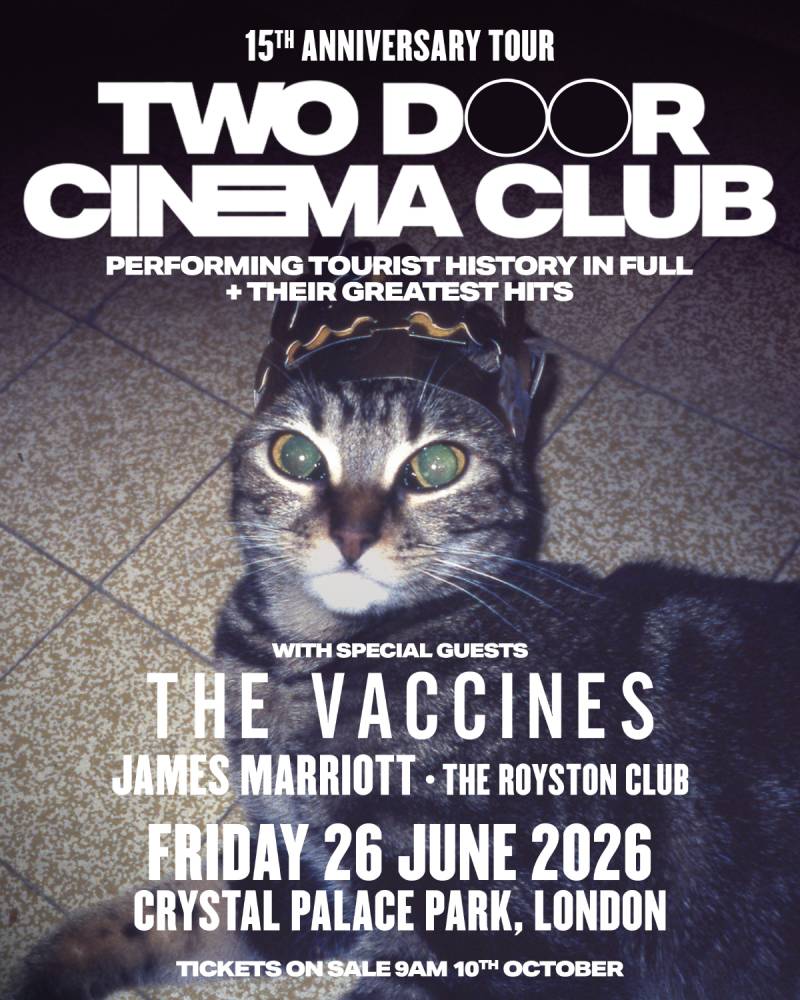 London, UK, 11:00AM Monday 6 October 2025: To mark the 15th anniversary of their debut album Tourist History, much loved Northern Irish indie band Two Door Cinema Club have today announced a huge outdoor show taking place at London’s Crystal Palace Park on Friday 26 June 2026, performing the album in full alongside some of their other greatest hits. They’ll also be joined on the day by special guests The Vaccines, playing What Did You Expect From The Vaccines?, plus alt-pop artist James Marriott and indie rock four-piece The Royston Club.
